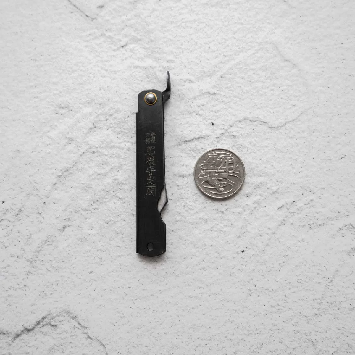 He named it “Higonokami Knife” because many of his customers were in Kumamoto area (formally Higo country), which turned out to dramatically increase his sales. The blades have gradually changed their shapes. Unlike single-edged knives, the double-edged blades (V-shaped cross section) were in those days considered common. The earlier blades had a sharper tip (shape of a bamboo leaf), but now they have square shapes. The sheaths had a vertically folding style and a cross folding style, now the vertical one has to be custom made.