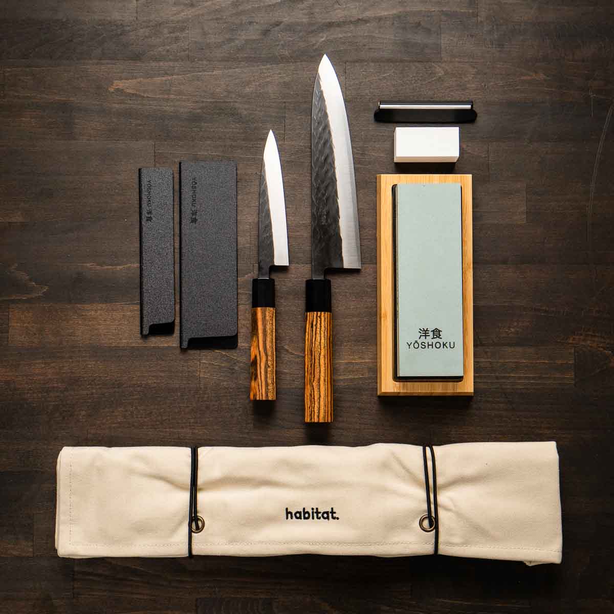 *Bundle includes Combination Whetstone, Base, Cleaning Stone, Guide Clip, and Habitat Knife roll & Blade Guards